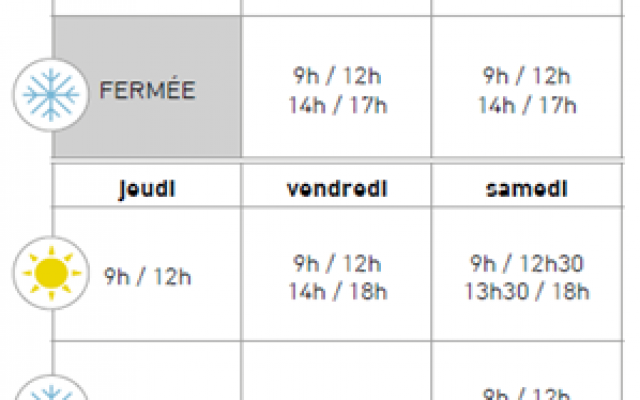 - Lundi, mardi, jeudi, vendredi et samedi : de 8h45 à 12h00 et de 13h45 à 17h00,