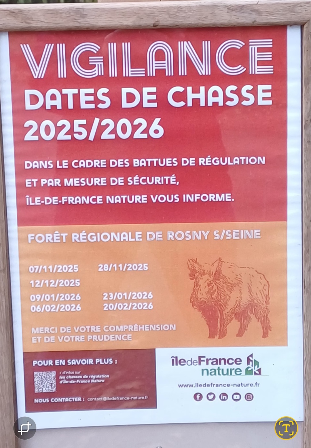 Accueil Dans le cadre des battues de régulation et par mesure de sécurité, Ile-De-France Nature nous informe des dates de battues et chasses suivantes, sur le domaine de la forêt de Rosny-Sur-Seine.