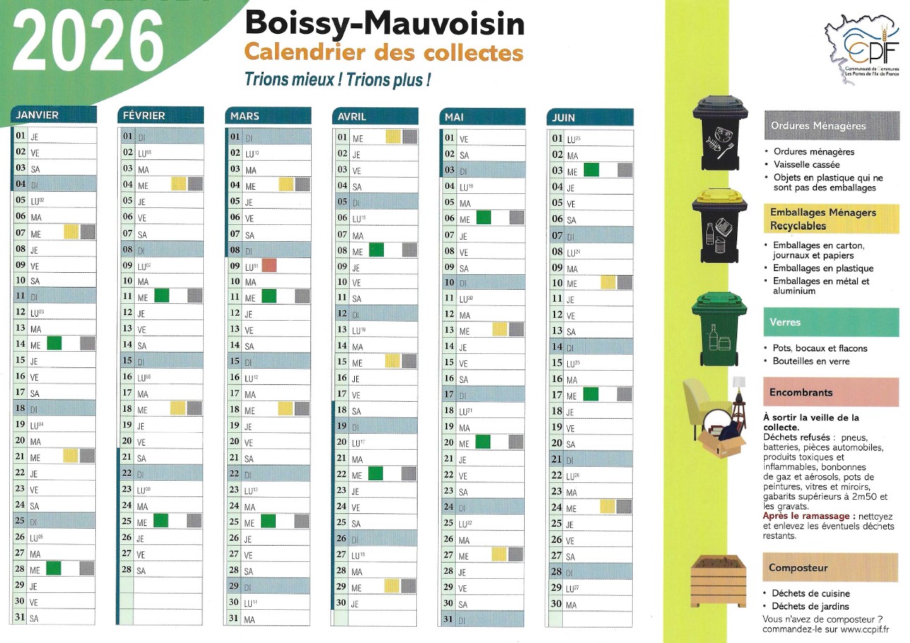 Les prochains ramassages des encombrants en porte à porte auront lieu, sur la commune de Boissy-Mauvoisin, le lundi 9 mars 2026 . Pensez à les sortir la veille. Pour mémoire les objets exclus sont : Ordures ménagères, amiante, pneus coupés, pots de peinture et tous liquides pouvant être toxiques ou inflammables, bonbonnes de gaz et tout ce qui est aérosol, batteries de véhicules, gravats, grandes vitres et, d’une manière générale, tous les gabarits qui sont supérieurs à 2m50.